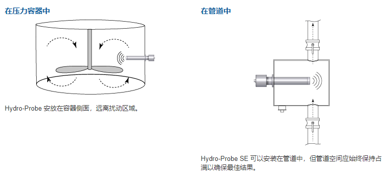 下面的示例顯示了在壓力容器和管道中安裝 Hydro-Probe SE 時的典型安裝示意圖。